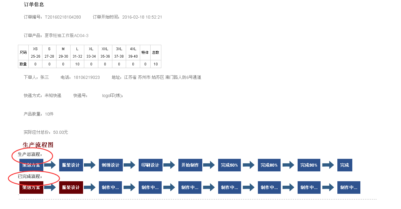 5,页面会显示订单需要经过的总流程和已经完成的流程,另外在厂家留言中会每日更新订单的状态备注等问题。