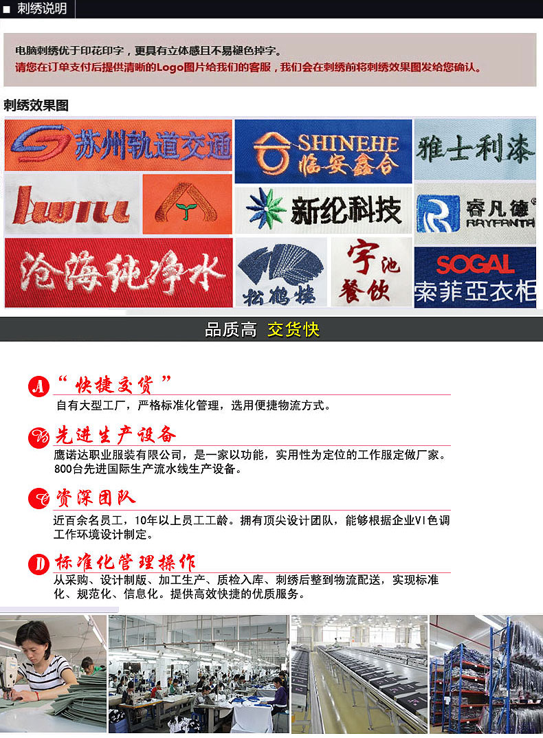 正是坚守着这种信念,历经16年的发展,由最初的10多人的起家的小企业,发展到今天拥有企业盐城骏放服饰,苏州鹰吉派劳保,苏州凯宏劳保下属3家企业,员工人数5000余人的大型企业,2001年按国际惯例组建了三大中心,生产中心以白大褂为龙头,推动其它产品,如t恤,西服,冲锋衣,安全帽等,营销中心从事产品开发和市场销售,目前遍及全国的营销网络已经形成。售后中心以帮助顾客解决问题的原则,7*24小时服务!